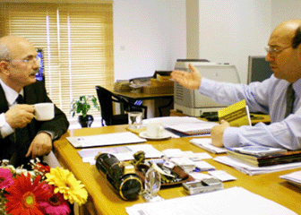 kırk yıllık bir dost gibi kucaklayarak karşıladı ve ofisine