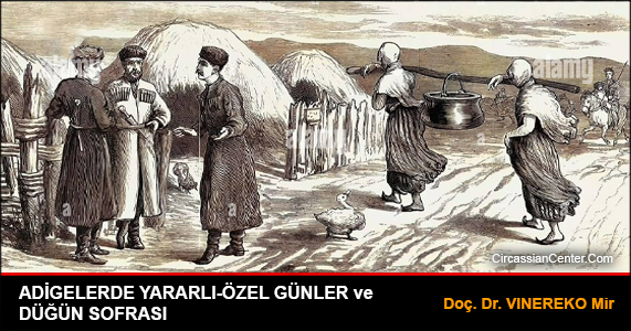 2) Dikkat edilirse, yemek listesinde içki bulunmuyor, bu da Adige geleneğinde alkollü içki kullanılmadığını belli ediyor. İçki Tatar, Abhaz, Rus, Türk gibi halklarla ilişkiler sonucu, bir kısım Adigelerce de içilmeye başlanmış olmalıdır. -HCY