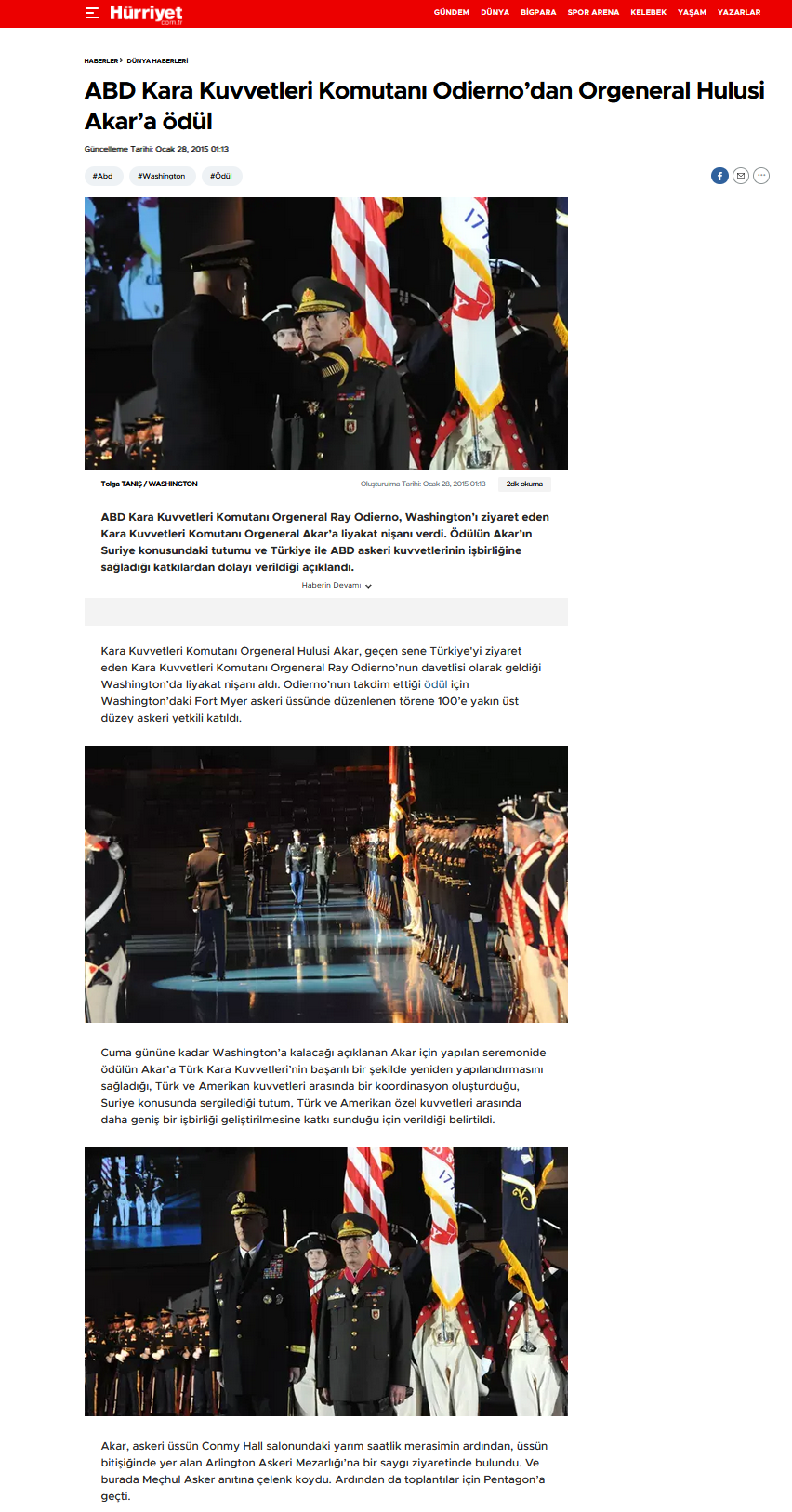 ABD Kara Kuvvetleri Komutanı Orgeneral Ray Odierno, Washington’ı ziyaret eden Kara Kuvvetleri Komutanı Orgeneral Hulusi Akar’a liyakat nişanı verdi.