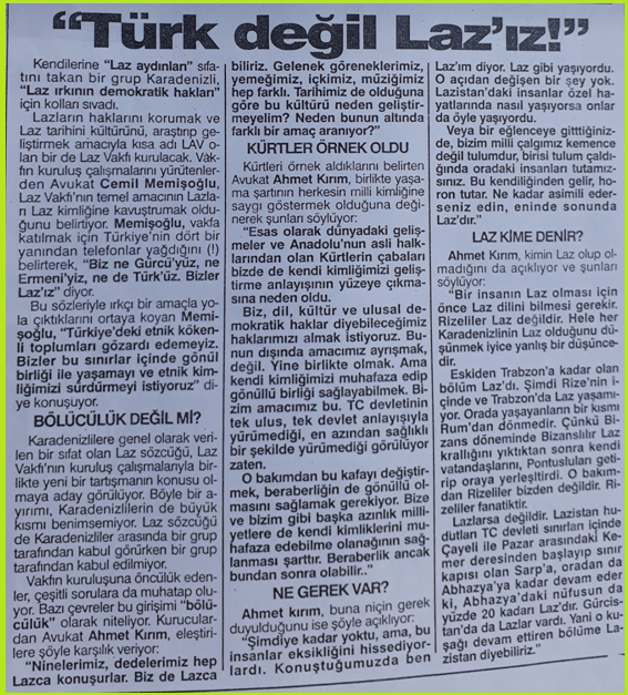 (Ön açıklama: Avukat Ahmet Hulusi Kırım ile arkadaşlarının 30 yıl önce Laz kimliğini yaşatmak adına yaptıkları çalışma ve açıklamalar zamanın basınında büyük yankılar uyandırmış, olumlu- olumsuz tepkiler almıştı. Hem Ahmet Hulusi Kırım ile arkadaşlarının söylediklerinin hem de onların bu söylediklerine olumlu- olumsuz tepki gösterenlerin söylediklerinin eleştirel katkıya muhtaç olduğu aşikâr. Ancak 30 yıl önce bütün bu söylenenler, bir döneme ışık tutmaları sebebiyle artık günümüzde tarihî birer önemli belge. Daha önce Haşim Akman’ın A Aktüel Dergisinin 66. sayısında yayımlanan haber- söyleşisini yeniden yayına hazırladığım gibi, o dönemde Ahmet Hulusi Kırım ile arkadaşlarının Laz kimliğini yaşatmak adına yaptıkları çalışma ve açıklamalara basından gelen olumlu- olumsuz tepkileri de yeniden yayına hazırladım ve konuya ilgi duyan okuyucuların bilgisine sunuyorum. Ayrıca belirtmeliyim; o dönemin iki önemli suskun tanığıyla olan söyleşilerim de yakında burada yayınlanacak. Ali İhsan Aksamaz)